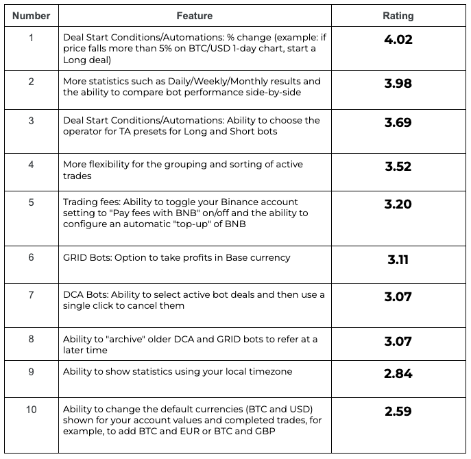 A common question after an extensive survey like this is, “Why can’t they work on feature X that seems really simple to fix?”. Some requests are going to be limited, not by the 3Commas platform, but rather by the API limitations of individual exchanges. Without diving too deep into technicalities, some API setups are more flexible than others, but 3Commas is actively seeking out conversations with the technical teams at these exchanges and it can take some time for discussions to bear fruit.
