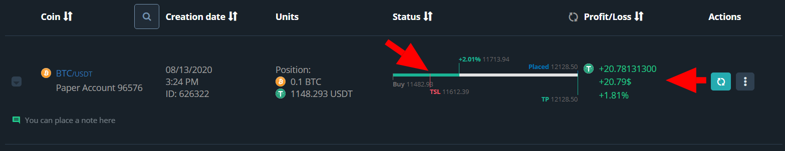 Let’s say, you enter a position, and set a Stop Loss at -5% of the entry price, if the asset price rises by 20%, your Stop Loss will automatically move to the + 15% level of the entry point and close at this level in case of a rollback.