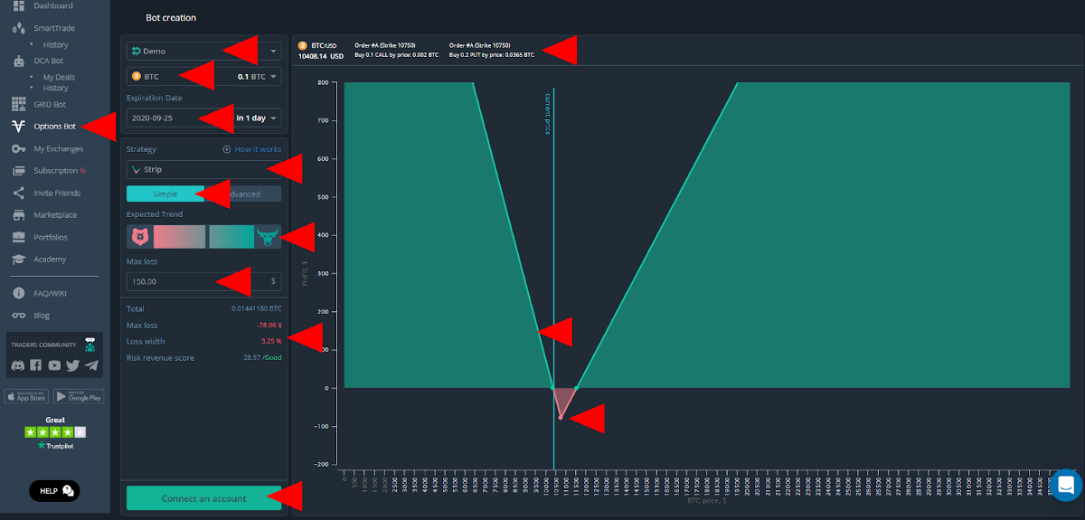For example, we believe that the price of Bitcoin is likely to drop the next day. We select a strategy from the list and adjust the position size, timing, maximum risks, and desired profit. With a Strip strategy, the bot will buy a Call option with a central strike and Put options in greater amounts with either a similar or a different strike. If you are not yet familiar with the concept of options, please read our detailed article on options before using this strategy. This strategy will help you aggressively earn when the price drops and hedge ourselves if the price goes up. Thus, if the price drops as we planned, we will earn double (Nx) profits, but we will also profit if the price goes up, (not as fruitfully though). In our case, we have set the risk profit ratio at 28.57.