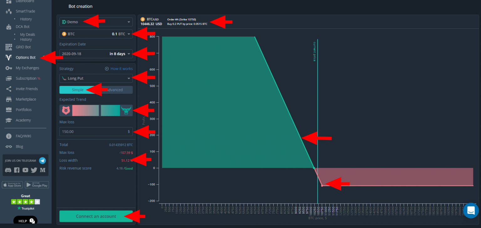 How many times have you encountered the price taking a direction opposite to your calculations, which triggered a Stop Loss and closed your position? The new 3Commas.io Options Bot will help you protect your main position easily and efficiently and earn money even if the price moves in an unexpected direction. To do this, use the Long Call or Long Put Options Bot strategy to open an Options position in the direction opposite to your primary position. In this case, if your main position reaches the Stop Loss, you can find success from the Options position, and if the price goes in the direction you’ve expected, your losses caused by the Options position will be covered by the success from the primary position. If you are not yet familiar with Options, make sure you familiarize yourself with our detailed article on Options before using this strategy.