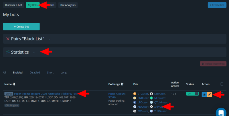 After the bot is created, it starts trading automatically. You can see the statistics of each of your bot, as well as view current transactions and change the trading strategy in the “My bots” tab: