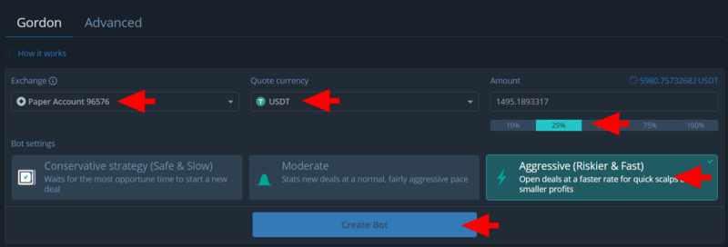 First, you need to choose an exchange to trade on, the coin you are planning to trade against, the share of the deposit that you would like to allocate for trading with the Gordon bot. It is also necessary to choose the intensity of the strategy that affects the frequency of transactions and how risky they will be. You can always familiarize yourself with the functionality using Paper Trading first: