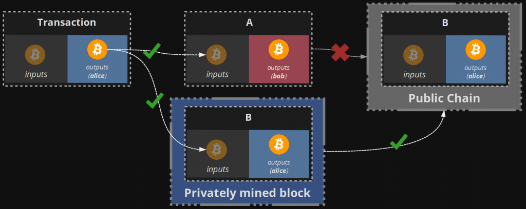 The attacker, completing the mining process, finds the blocks and adds certain transactions, sending their funds to new addresses they own. In this case, the blocks are not broadcasted to the network but form a secret chain. Then they send the same funds to a merchant, repeatedly spending the funds. The merchant receives the funds, transfers the goods, and the attacker broadcasts their block, containing the transaction, which sends their own funds to one of the new addresses created previously, provided that this transaction is accepted earlier.