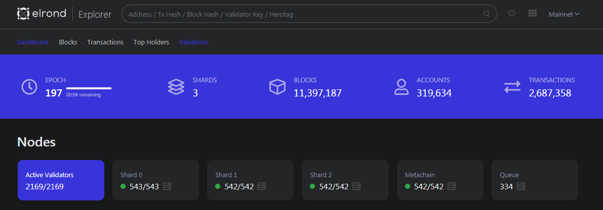 In the first testnet implementation in 2019, the network managed to process more than 12,000 transactions per second. In July 2020, following successful testnet trials, the main Elrond network was launched and now has more than 2,000 validators. Currently, more than 2.5 million transactions have been completed since its launch in 2020.