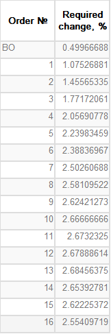 Look at the example. Upon execution of all orders, we see that the deviation from the level of profit-taking is not more than 2.55%.