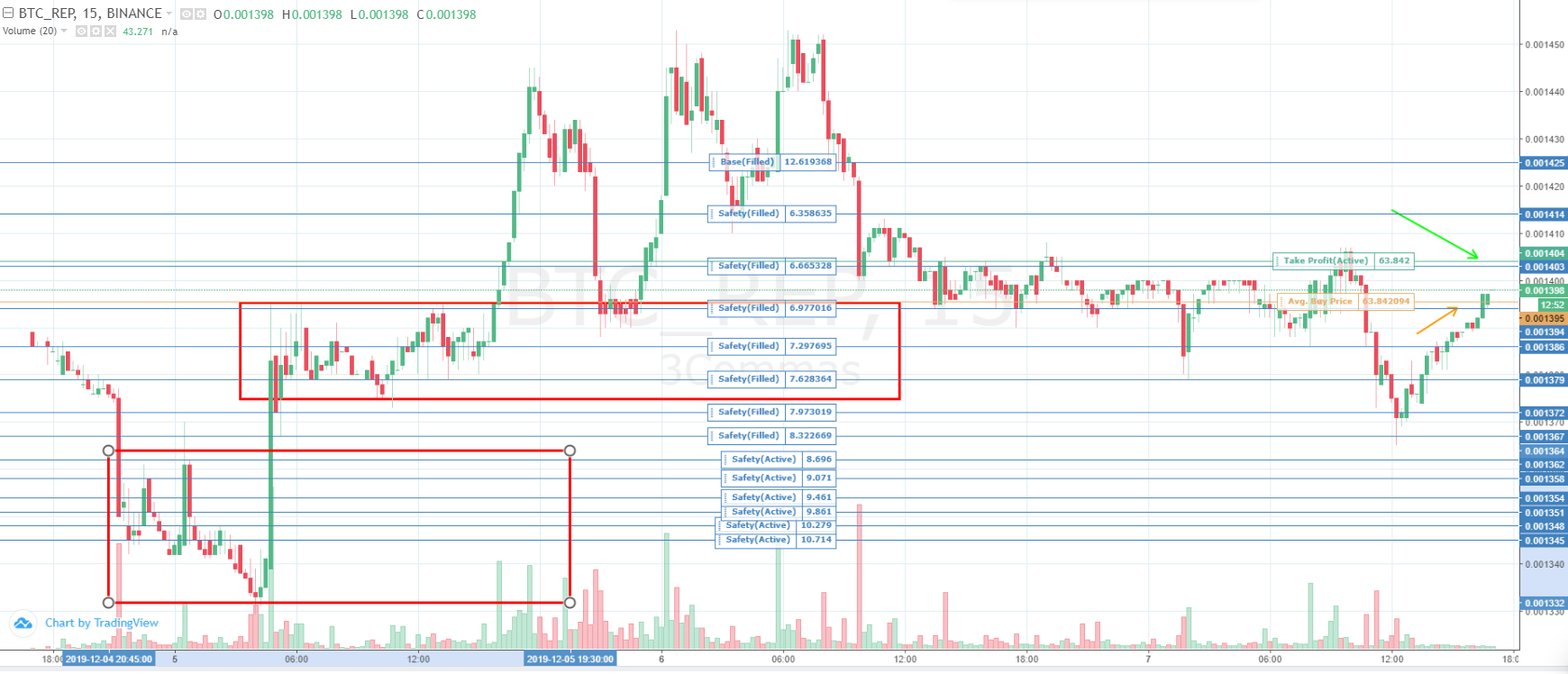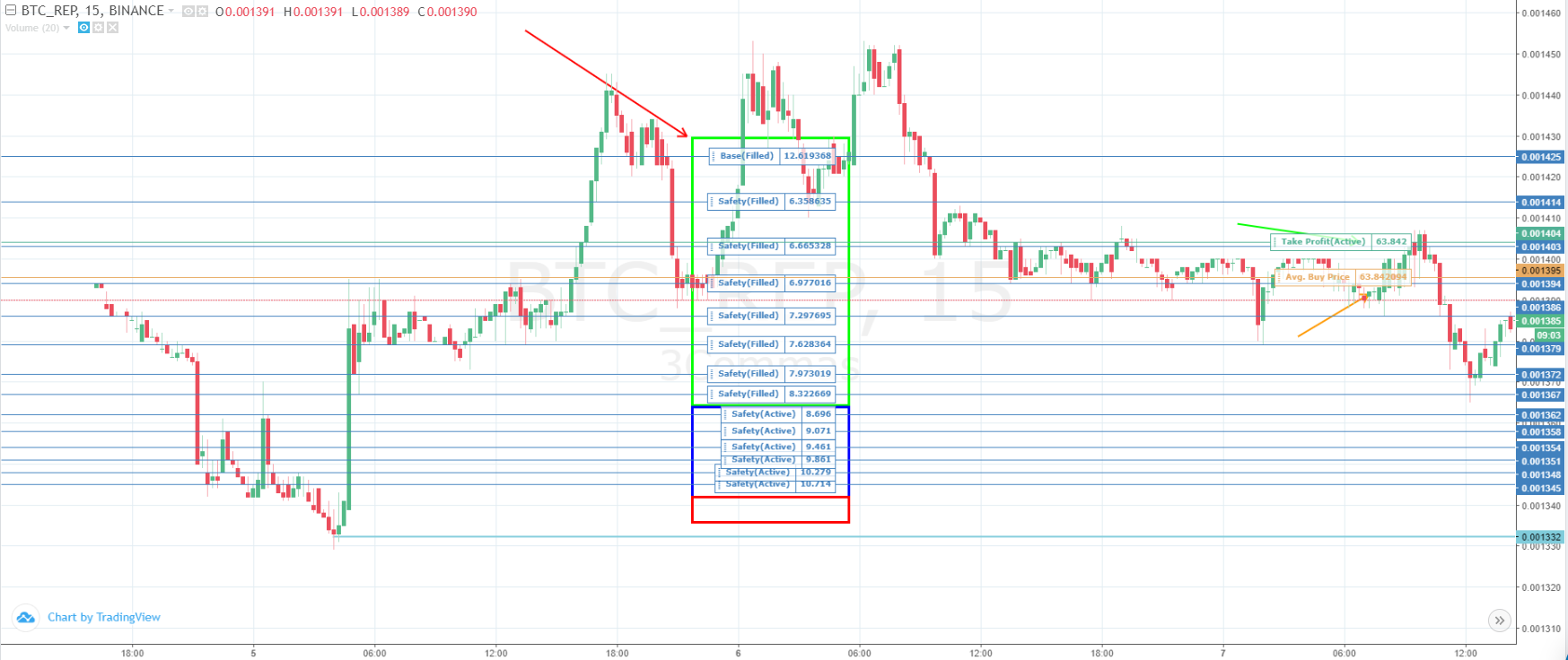 As for the first signal, the situation with it is much more enjoyable. The red arrow marks the original entry point. Immediately after it, six safety orders line up below, which come with compaction and growth in size. When each of the six orders is executed, a new one opens even lower. Such a margin allows you to catch the squeeze of the candle (a long shadow of the candle to take out the stops) and instantly close the position with a good profit.