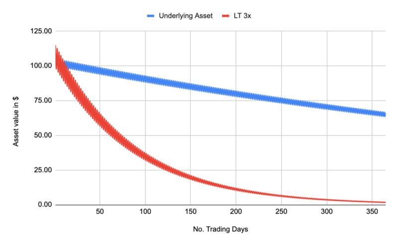 Let’s assume that the underlying asset grows by 5%. Accordingly, the leveraged token would increase by 15%. The next day, the underlying asset falls by 5%. Therefore, the token would drop by 15%. As a result, we have a total loss of 0.25% in the underlying asset and a loss of 2.25% in the leveraged token.