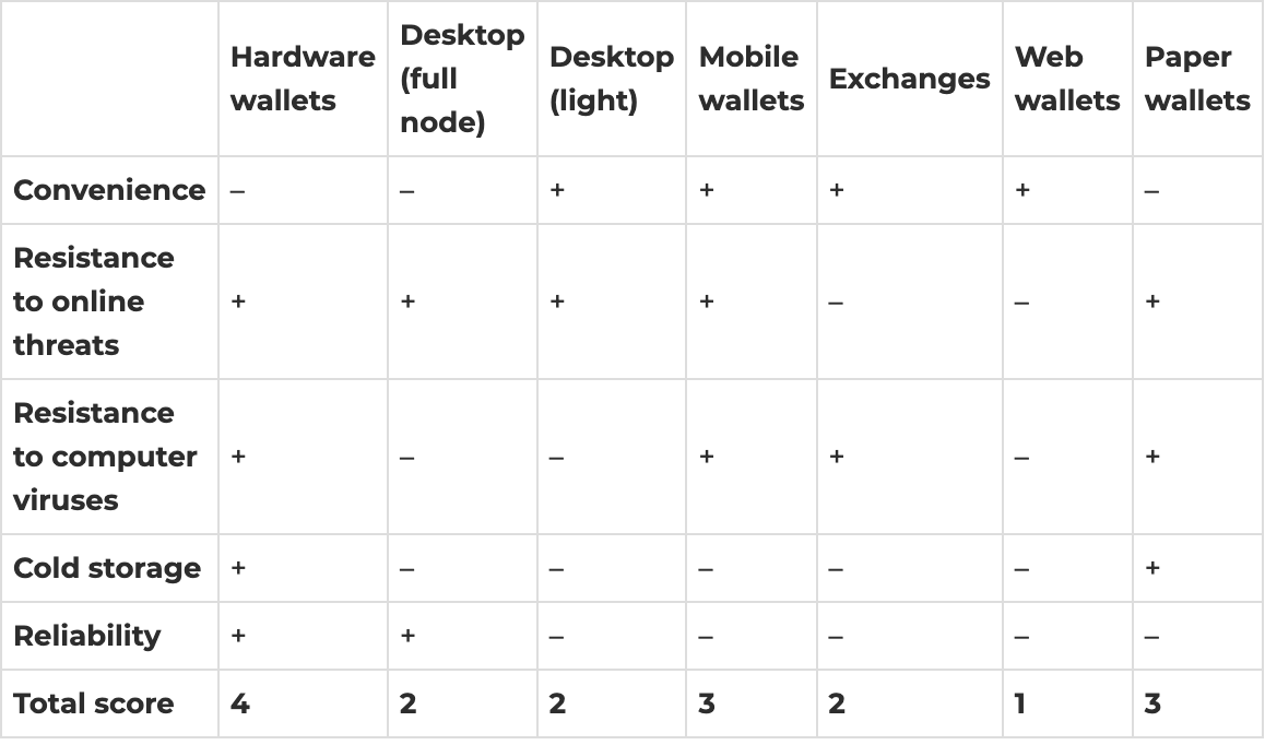 Have a look at the table comparing different ways to store crypto assets in terms of convenience and security.