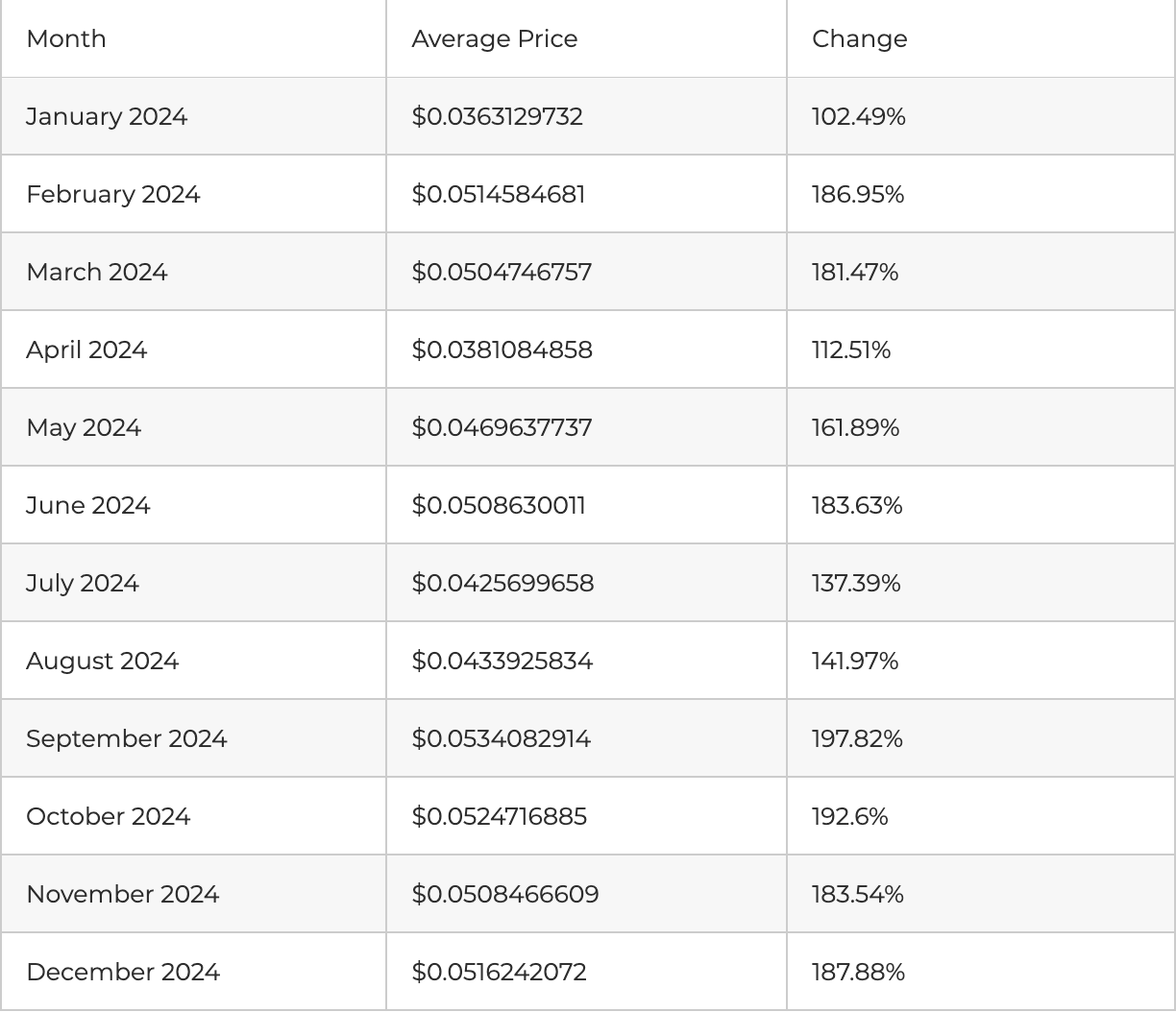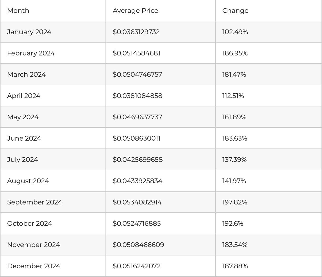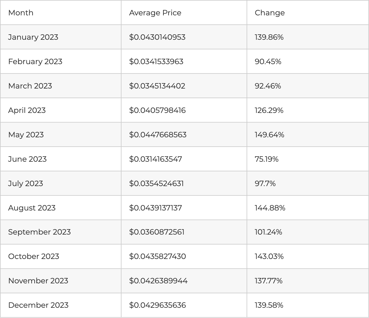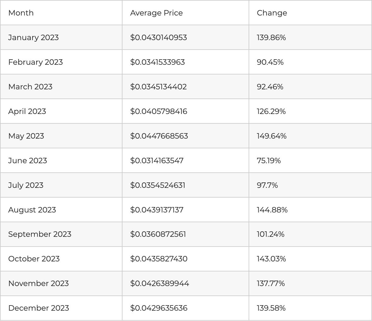 By the end of 2023 – December 2023 – the coin might make another little jump in price to $0.0242. Similar to the rest of the year, the fluctuations are likely to be significant – $0.0205 minimum and $0.0302 maximum.