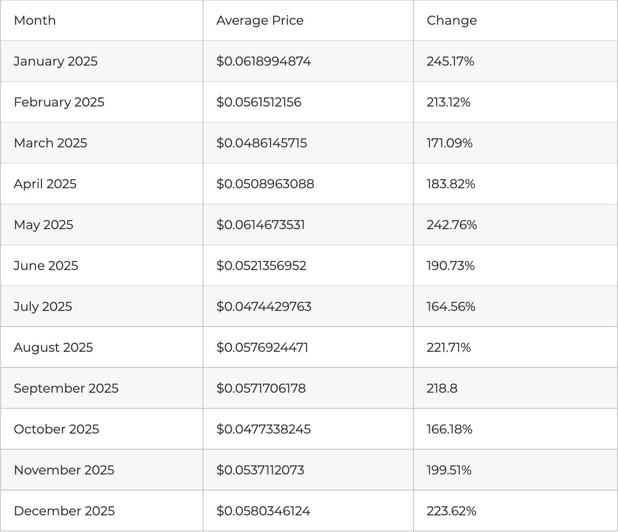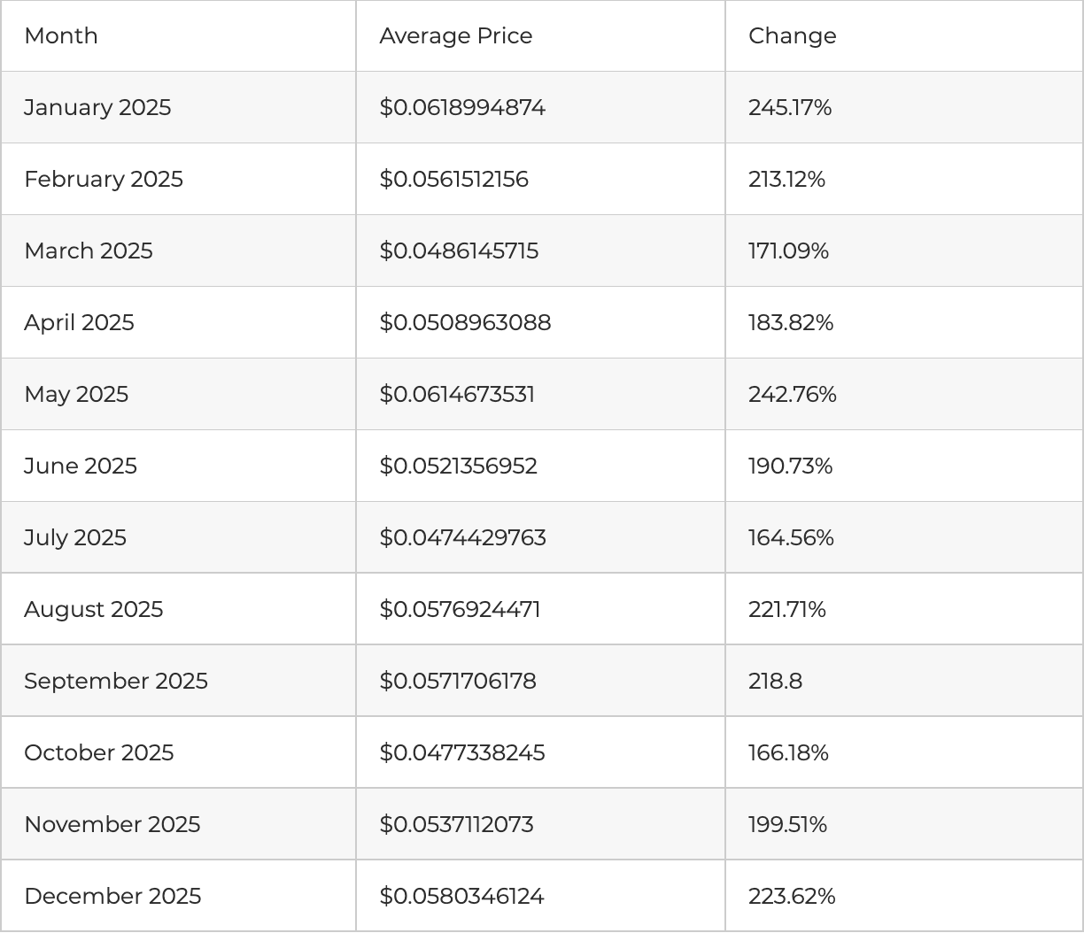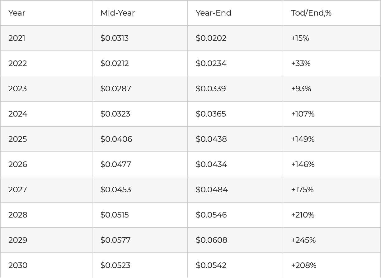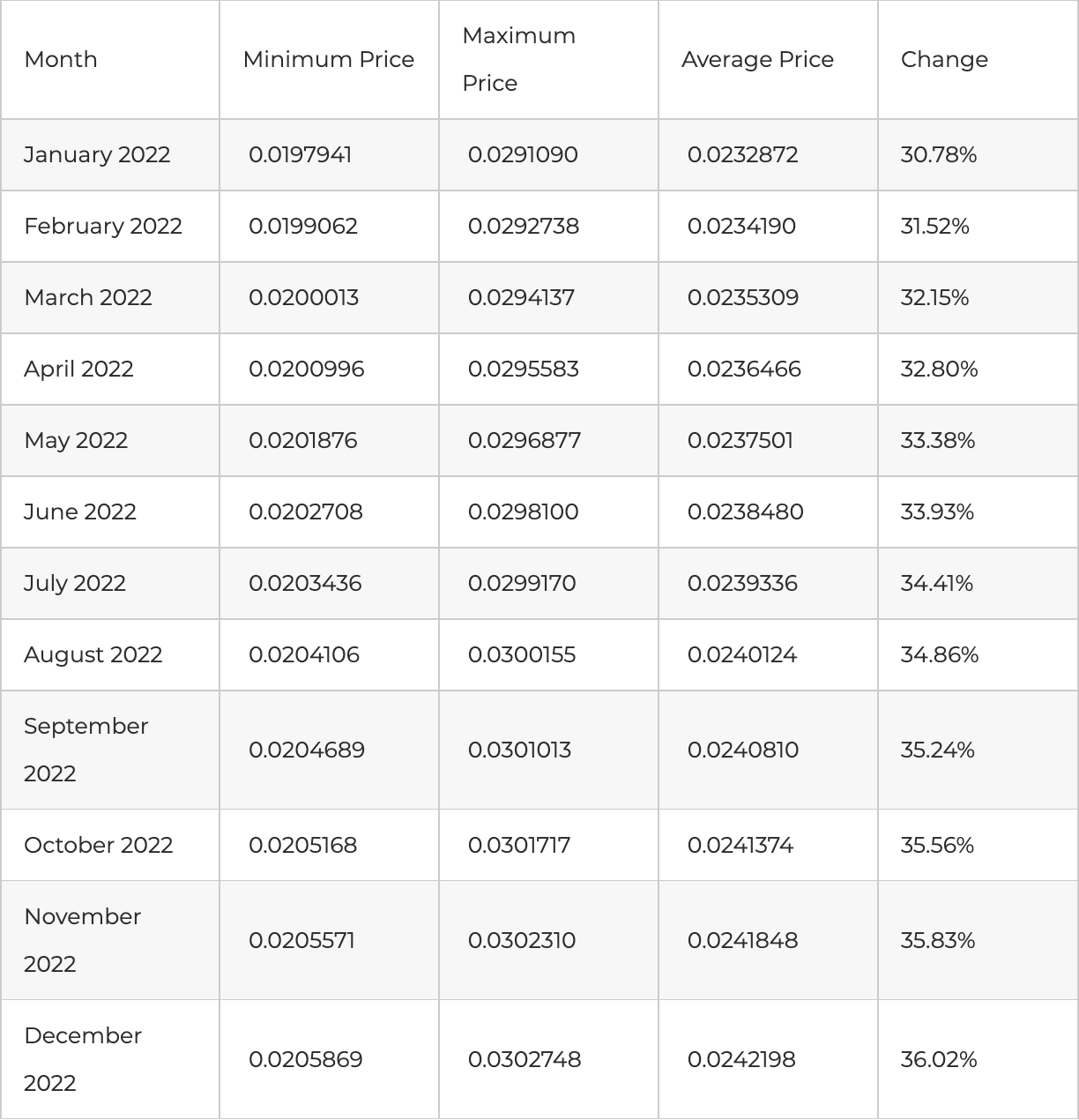 Going into December 2021, the average price is likely to be around $0.0242. The lowest point for the month is expected to be at $0.0190, and the highest price point – at $0.0296.