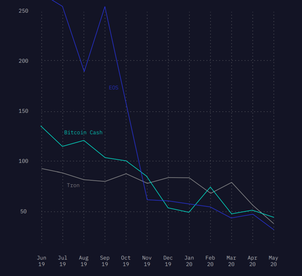 For example, by checking transaction data from October 1, 2019, to April 30, 2020, the analysts found out that most of the EOS and Ripple transactions showed characteristics that resemble DoS attacks. 95% of EOS transactions were initiated by the EIDOS airdrop.