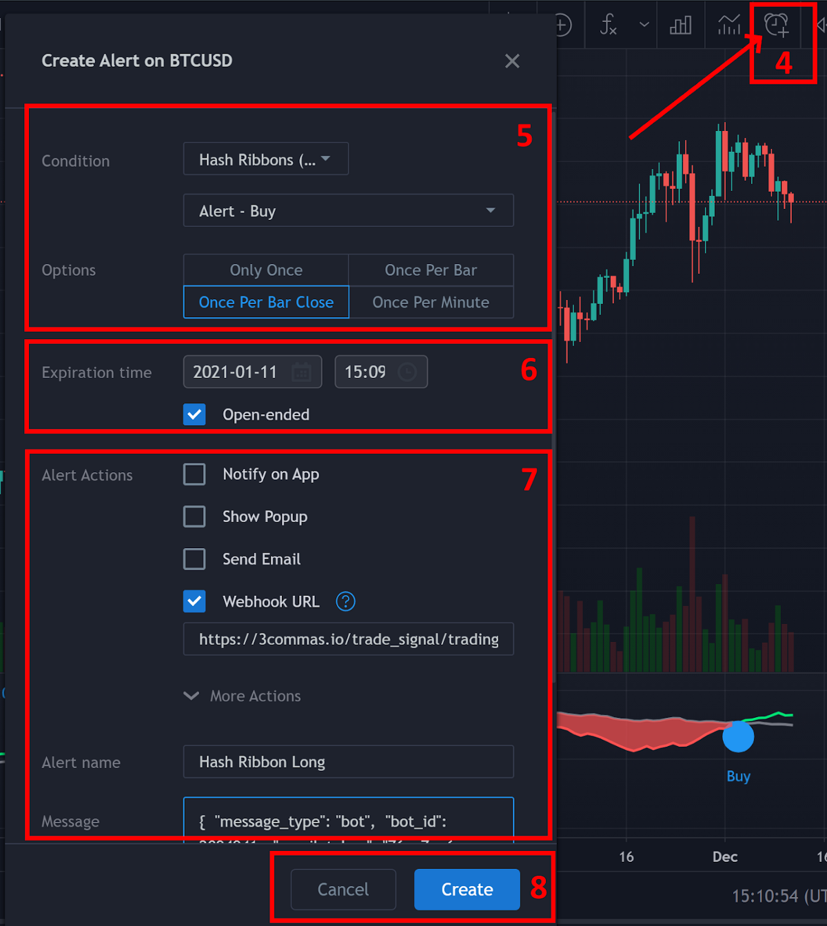 For the Alert Actions (7), choose Webhook URL and enter: https://app.3commas.io/trade_signal/trading_view