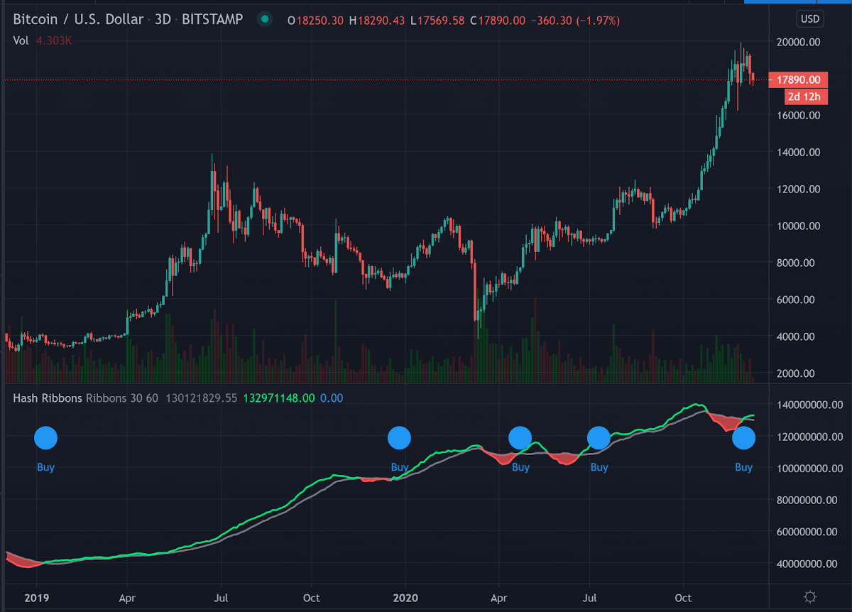 Hash Ribbons allow you to visualise the Hash Rate to perform technical analysis on this data. Hash Ribbons usesing a combination of algorithms, typically combined into an indicator you can add to your Bitcoin charts in platforms like TradingView.com.