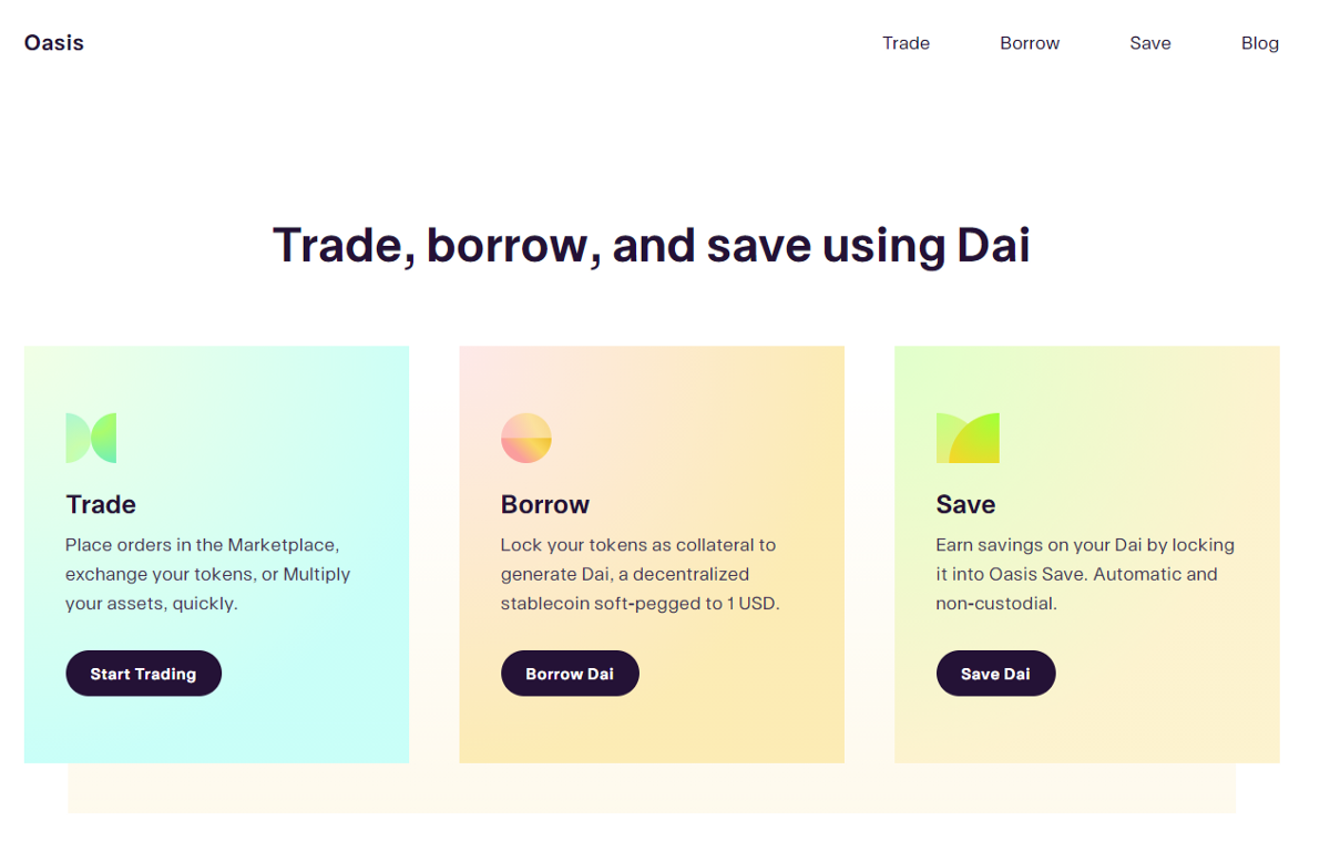 Maker allows any user to take a DAI-nominated credit, secured through smart contracts by other assets such as ETH. With the release of a multi-tax version of Dai (MCD) in 2019, it became possible to provide collateral for several types of assets, such as ETH, BAT, WBTC, and USDC, with a single asset (SAI). The Oasis Borrow interface was also launched to store collateral, and Oasis Save was introduced to lock DAI stablecoins with interest.