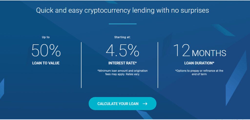 The platform offers such collateral options as BTC, ETH, LTC, and GUSD. BlockFi allows users to earn complex interest on deposits, providing cryptocurrencies as collateral. Credits on the platform are available at an interest rate of about 4.5% per annum. And it is mandatory to provide personal information in order to get a loan.