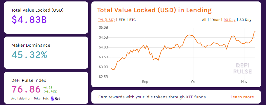 At the time of writing, the total amount of blocked funds on lending- and borrowing-related platforms has almost reached $5 billion, 45% of which are blocked on the most popular lending platform MakerDAO.