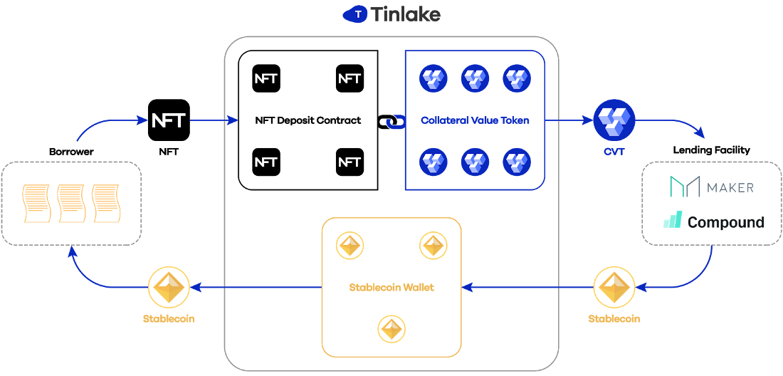 Tinlake provides the ability to combine NFTs and smart contracts and use them as collateral for borrowing stablecoins.