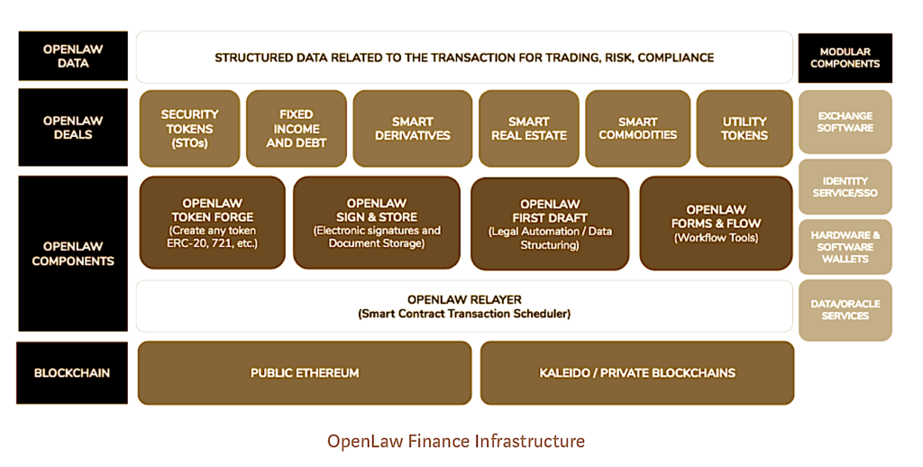 OpenLaw Finance users can create and issue security-tokens, bonds, and other debt-based assets, intellectual derivatives, and tokenize goods. OpenLaw Finance is connected to a decentralized 0x exchange and has the essential tools to perform AML/KYC procedures.
