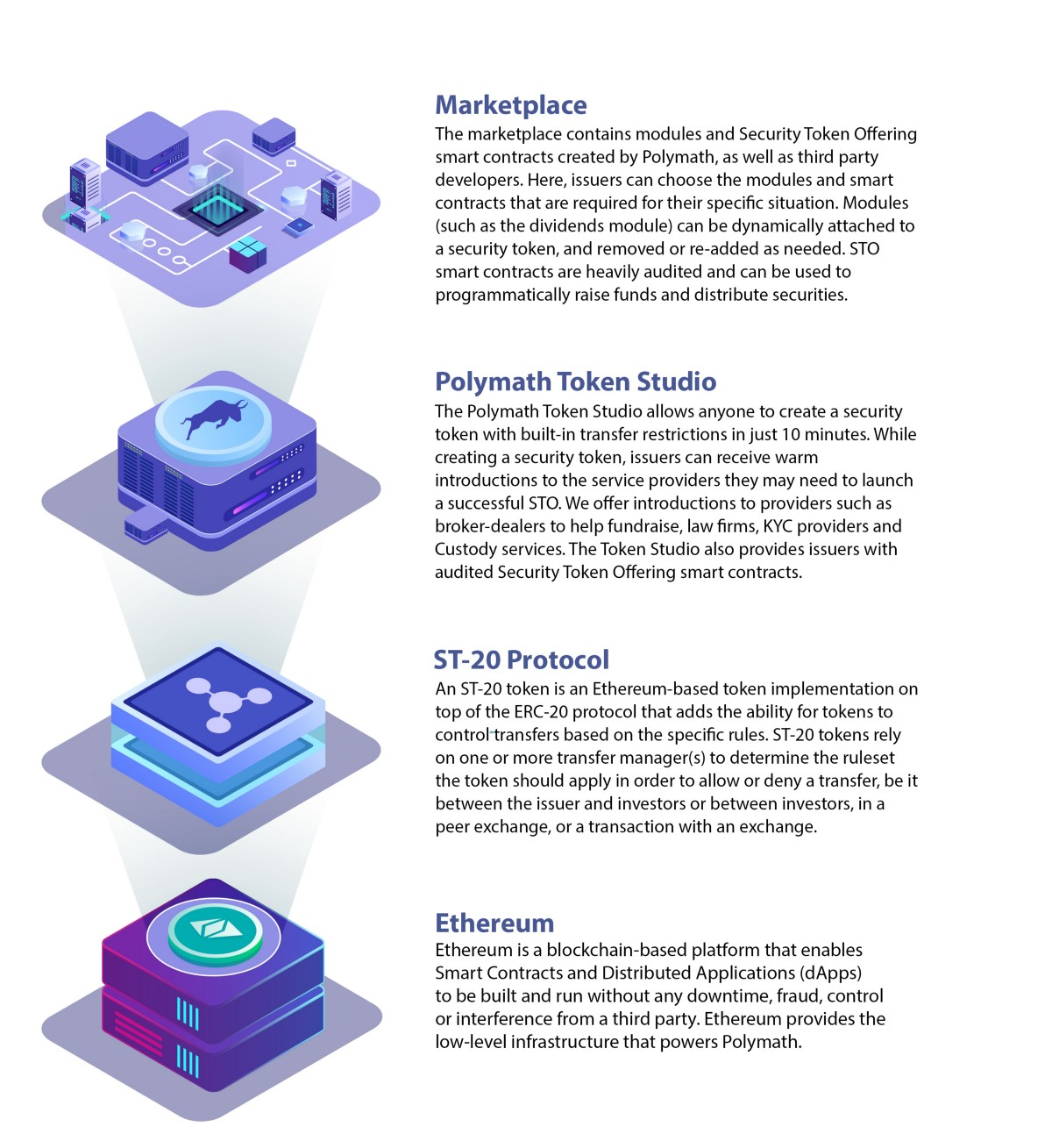 Polymath is an ERC20-based blockchain platform that acts as a service provider for creating, issuing, and managing tokens. Polymath acts as a guide for issuers wishing to launch their token in accordance with all regulatory rules.