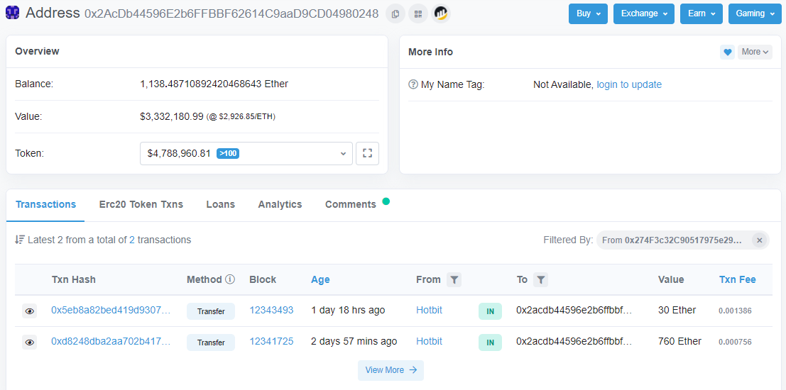 Some time after the announcement, a number of transactions were made from Hotbit wallets. The exchange stated these were transfers to their new cold wallet and users’ crypto “remains safe”. For example, below are two transactions from Hotbit’s wallet to 0x2AcDb44596E2b6FFBBF62614C9aaD9CD04980248 of 30 and 760 ETH. The transfer of funds caused bewilderment and concern among users; many of them began to speculate that there was, in fact, no hacking, and the exchange is just robbing the customers.