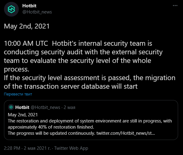 However, Hotbit’s Twitter account is still posting platform maintenance updates. Here’s the latest post from their official Twitter account: