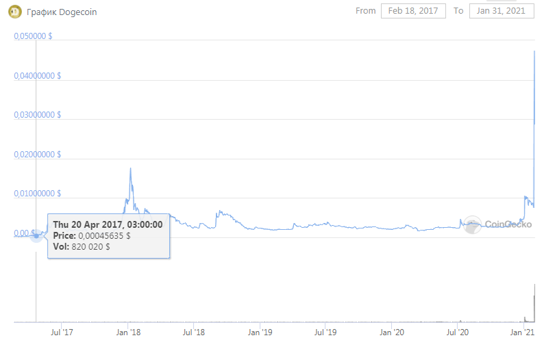But despite this drop, at the beginning of 2021 the price of Dogecoin set a new ATH, nearing 5 cents per meme-coin. The rise in price was attributed to Elon Musk’s tweet, which reminded his followers of his support for Dogecoin, followed by a pump from WSB subreddit participants who decided to dive into crypto after disturbing the traditional financial markets.