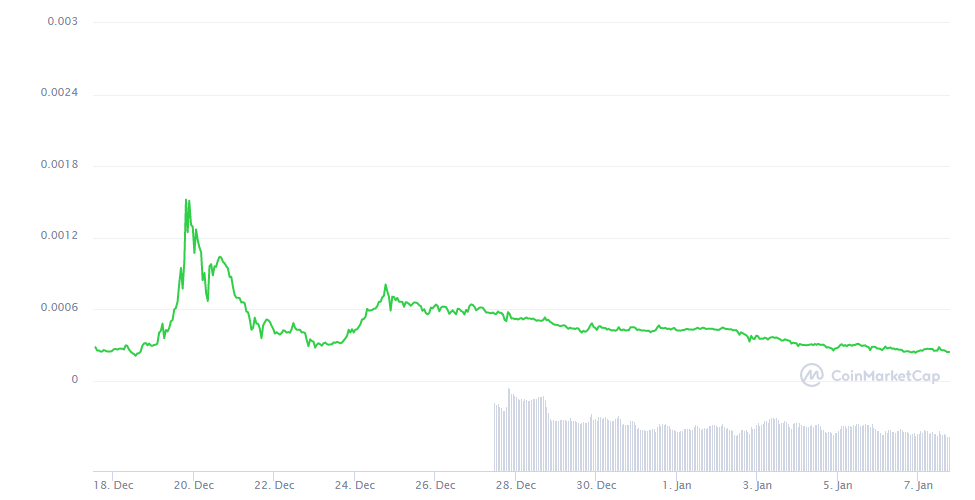 After its first plunge, the coin rose in value again as early as mid-December. The increase in price was almost 600%, and the value of the coin was estimated at $0.00151.